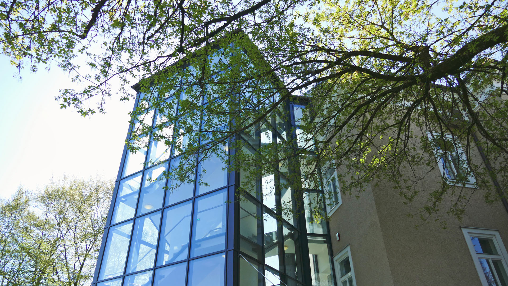 Der neue Stiegenhauskörper ist als transparente Stahl-Glas-Konstruktion ausgeführt. In seiner schlichten und klaren Architektursprache tritt er bewusst in einen Dialog mit dem historischen Bestand: Der Kontrast zwischen moderner Leichtigkeit und historische Massivität betont den Wert beider Bauphasen. Durch die zurückhaltende Formensprache fügt sich der Neubau harmonisch ein, ohne die prägnante Identität des Altbaus zu überlagern.
