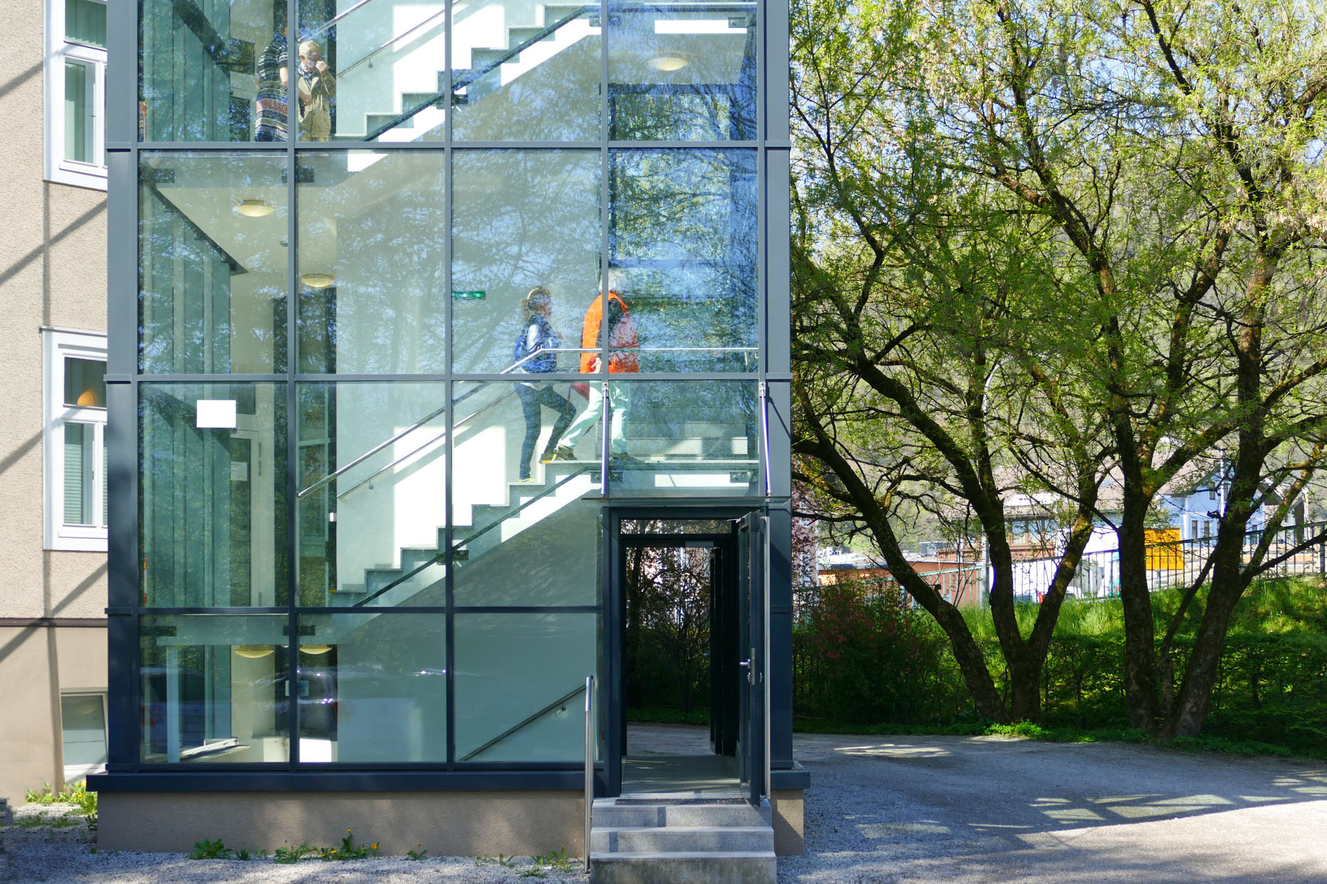 2010. Im Zuge der Modernisierung des Ärzteforums Hallein wurde ein barrierefreies Stiegenhaus mit Liftanlage errichtet. Die bestehende historische Substanz konnte die heutigen Anforderungen an Barrierefreiheit nicht mehr erfüllen. Durch den Abbruch der internen Treppenanlage entstanden zugleich erweiterte Nutzflächen für die Ordinationen.